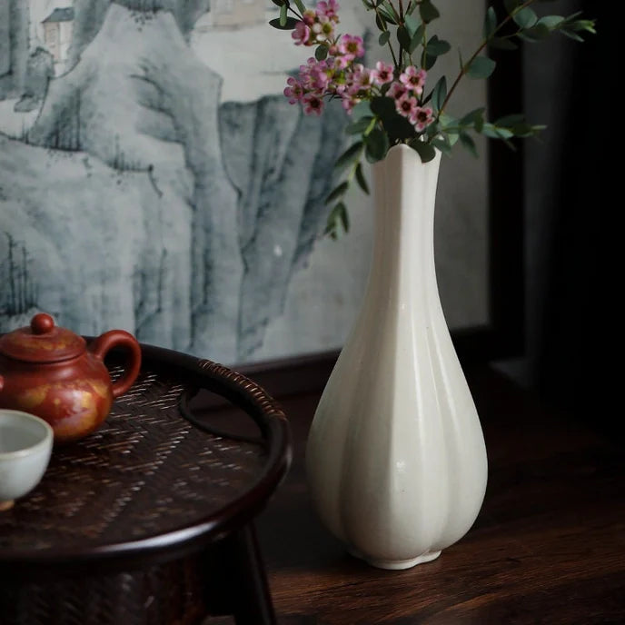 Elevate your interior with this Handmade White Ceramic Tall Vase. This elegant piece features a smooth white finish with refined, handcrafted detailing that exudes minimalist luxury and artistic charm.